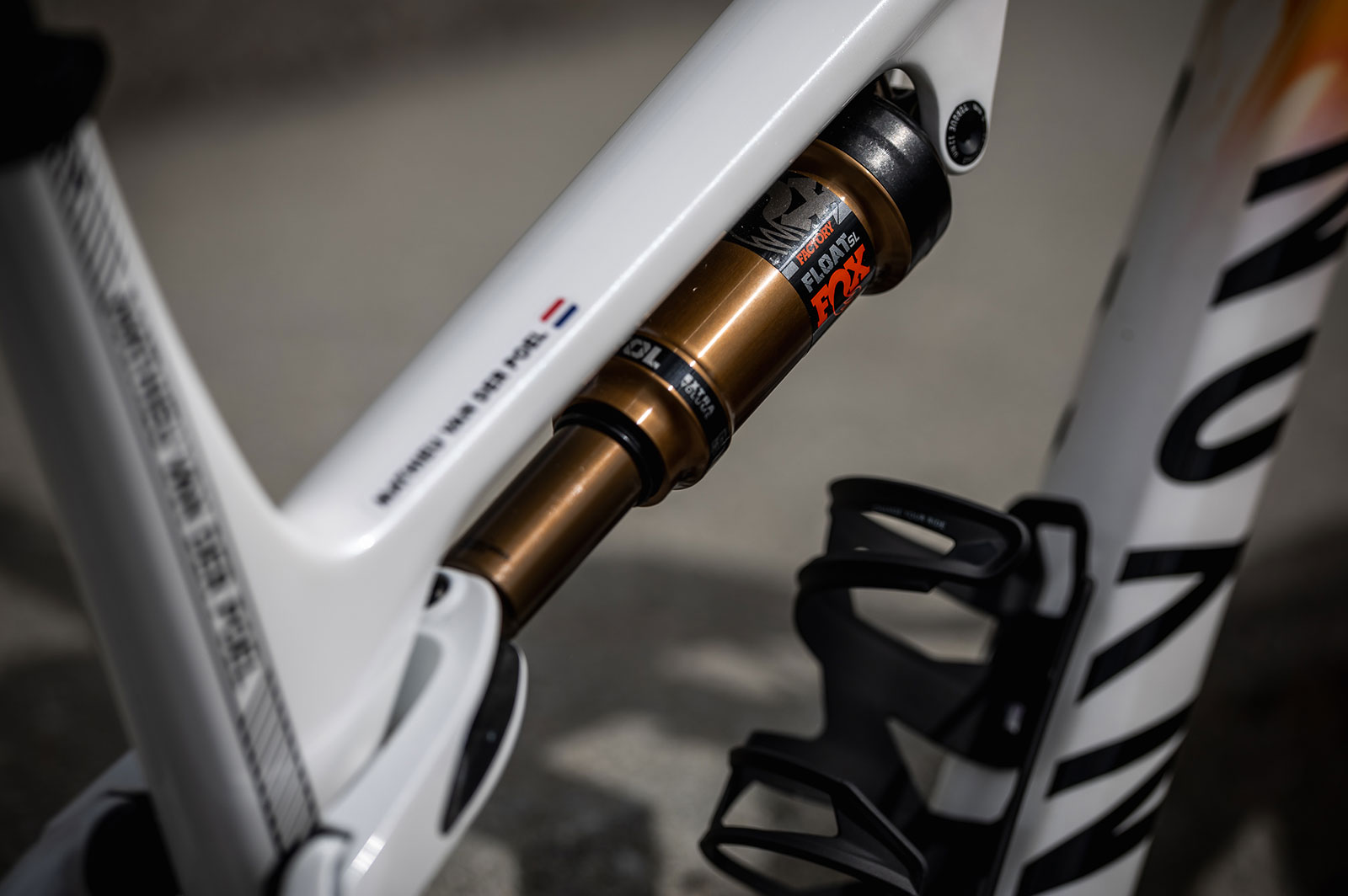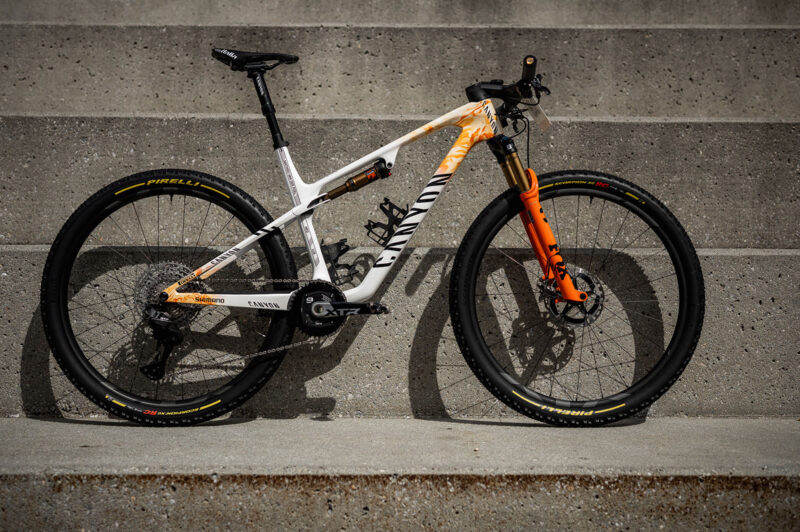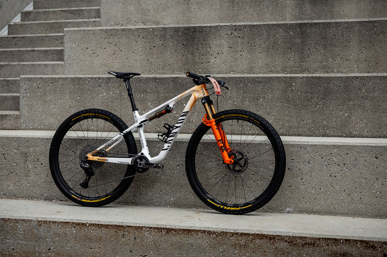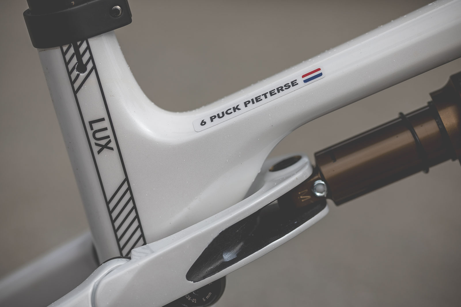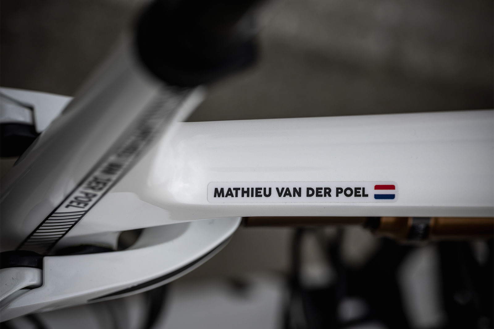 Het verschil tussen de fiets van van der Poel en Pieterse is dat laatstgenoemde rijdt met de ‘Lite’-versie van de Pirelli Scorpion XC Race banden. Ook zit er verschil in de voorvork waarbij Pieterse kiest voor de Fox 32 Step-Cast vork met 100mm travel, zien we bij van der Poel de Fox 34 Step-Cast demper met 120mm travel. En natuurlijk zit er een verschil in de maat van het frame. Dat zie je goed terug aan de namen die op de zitbuis van het frame staan.