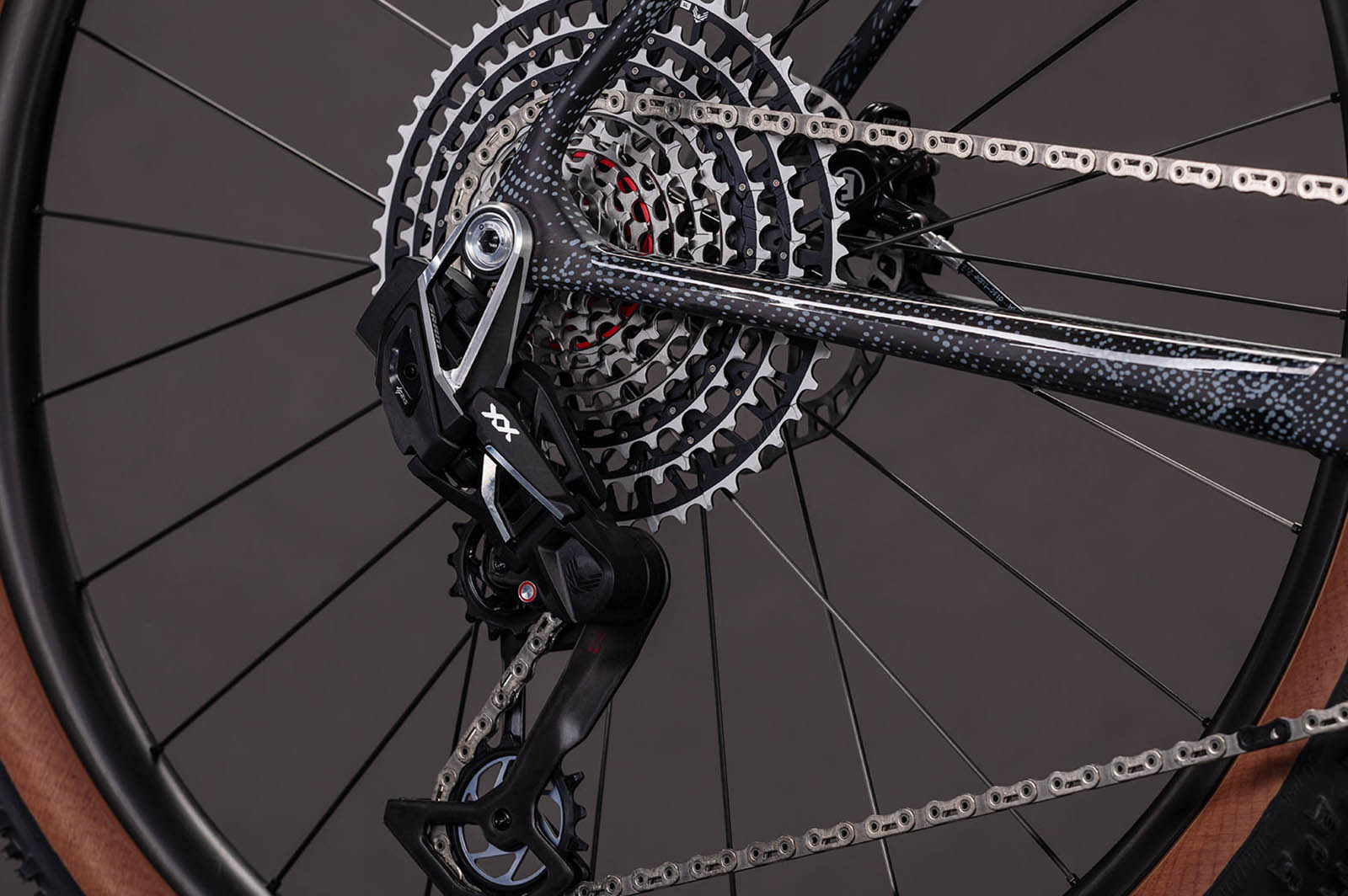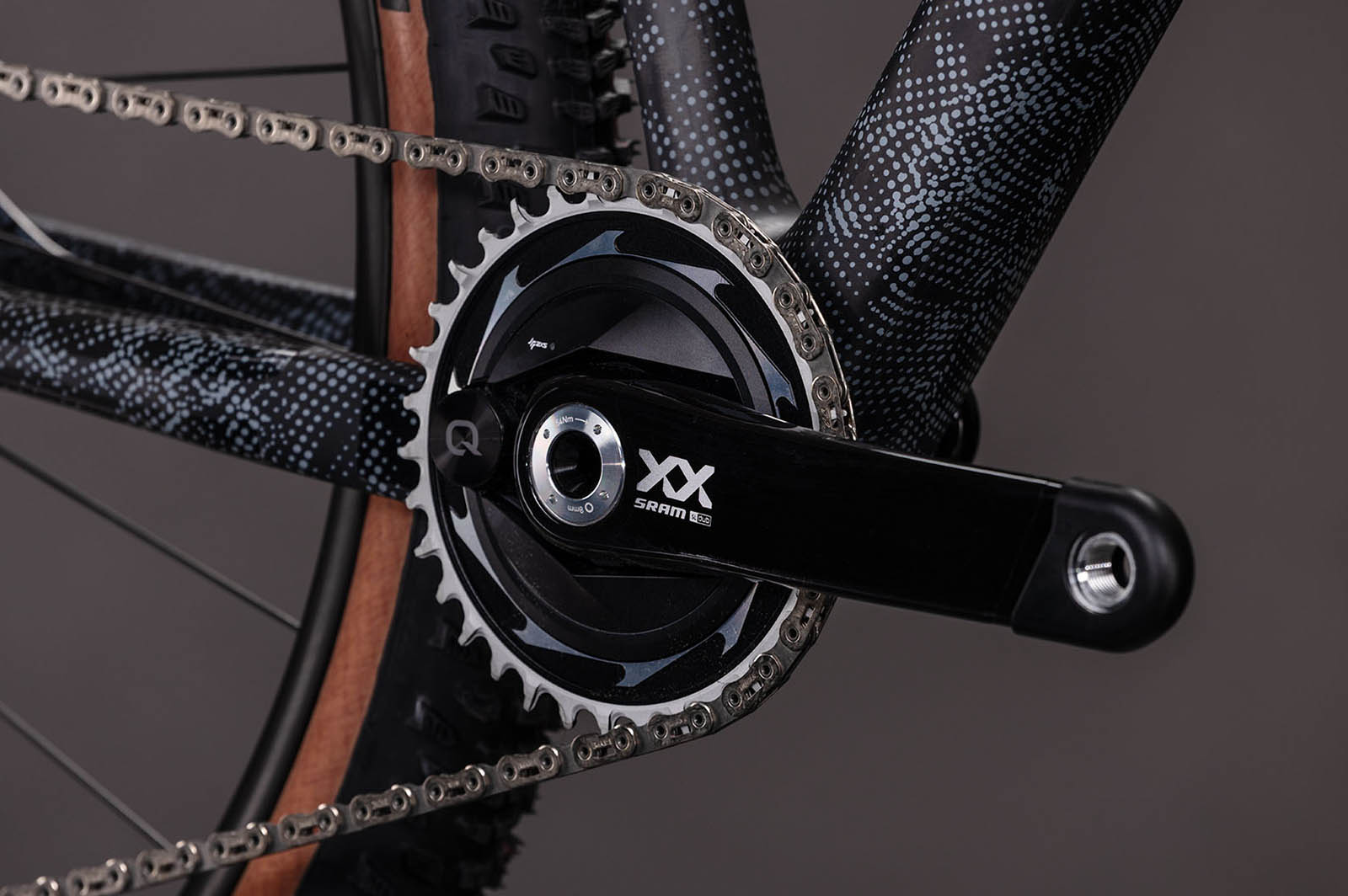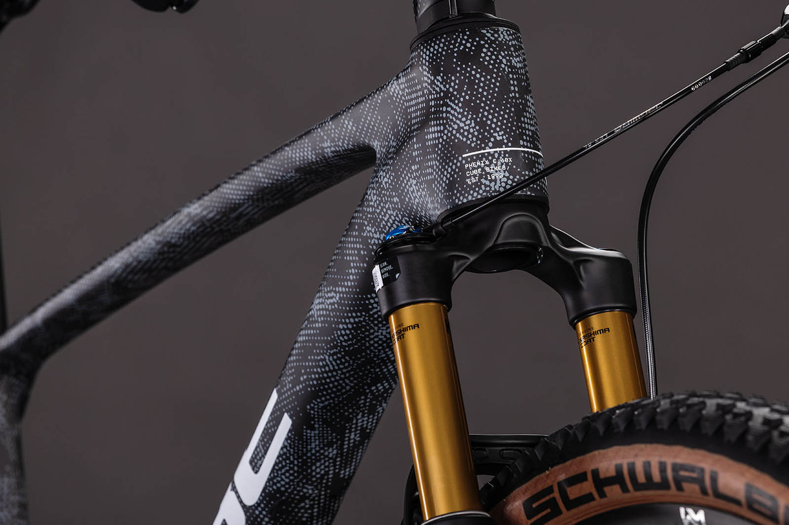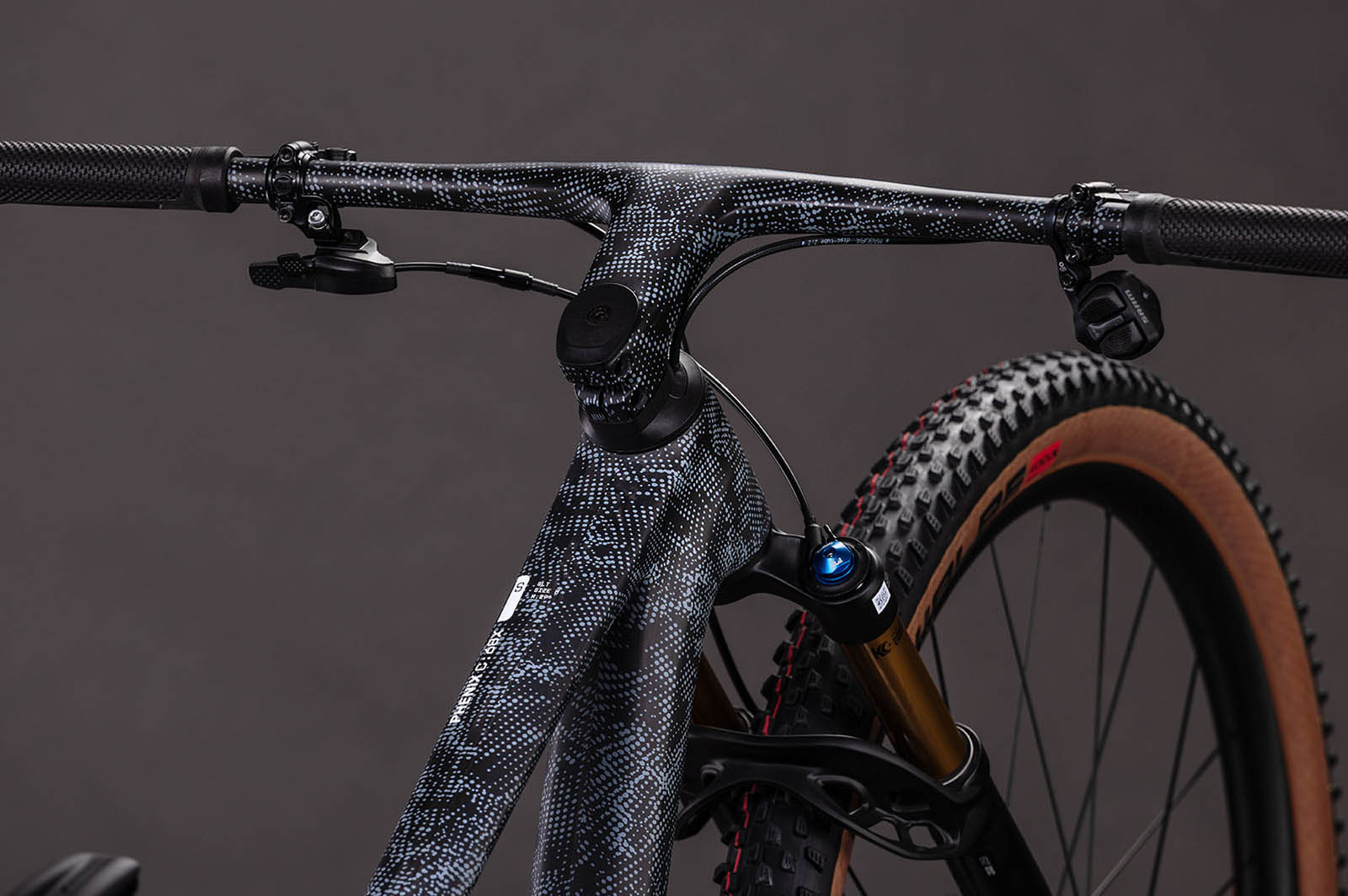 Wat ook meteen opvalt, is de geïntegreerde cockpit die op dezelfde manier is meegespoten. Het maakt deze uitvoering meteen compleet en af. Net als de rest van de specs. De aandrijving is SRAM XX SL Eagle Transmission mét powermeter, een Fox 32 SC Float Factory Grip SL van 100 mm en een MT8 remset van Magura. Wielset? Ook dik in orde met een Newman Phase 30 voorzien van 24 carbon spaken. En licht van gewicht met minder dan 900 gram voor een frame en 8,7 kg in totaal!
