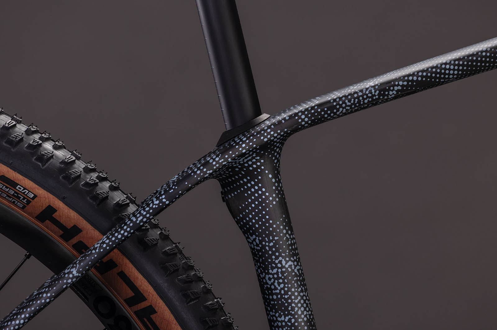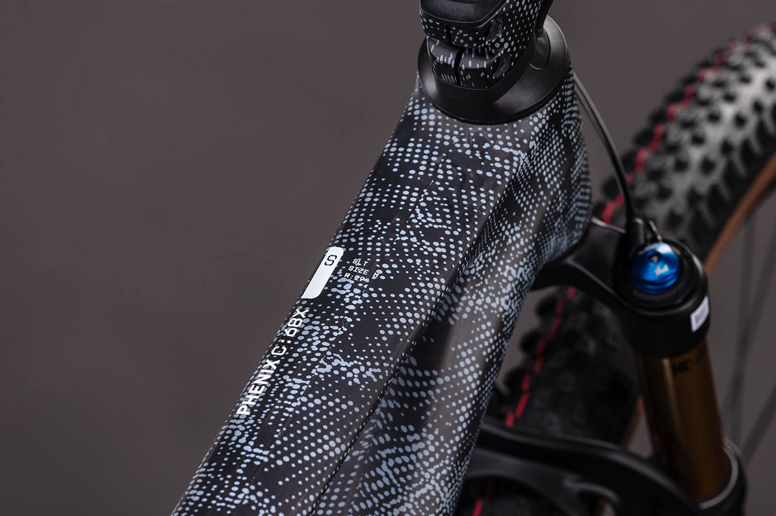 Officieel noemt Cube het Matrixblack´n´white, maar van veraf vind ik het wat weg hebben van een grijze spijkerbroekpatroon. Een beetje zoals de ploeg van Mathieu van der Poel (Alpecin Deceuninck) afgelopen jaar een blauw jeans patroon in hun kleding had zitten. Van dichterbij zie je dat het witte stipjes op een matzwart frame zijn bij deze Cube Phenix, maar het resultaat is echt goed.