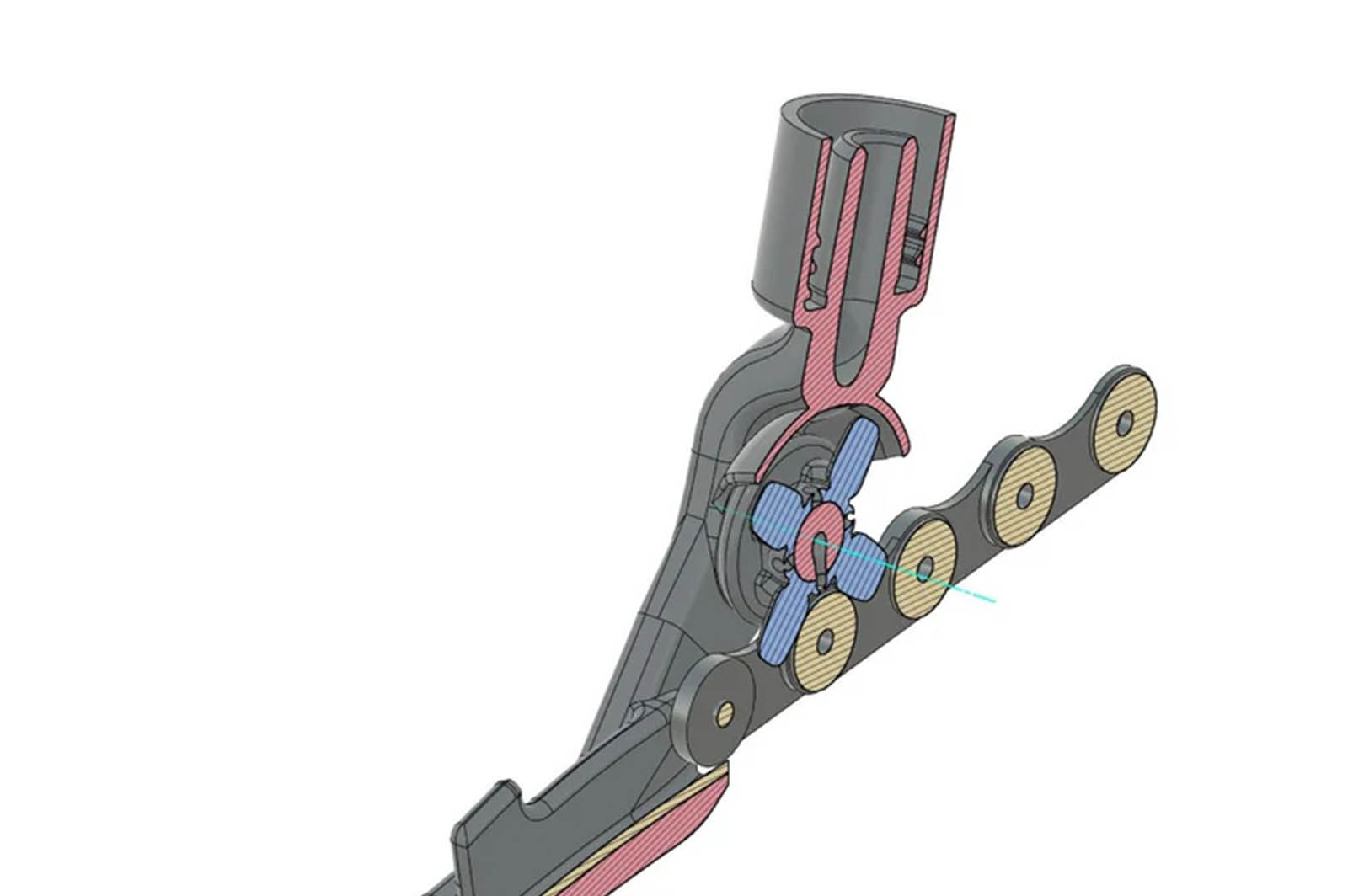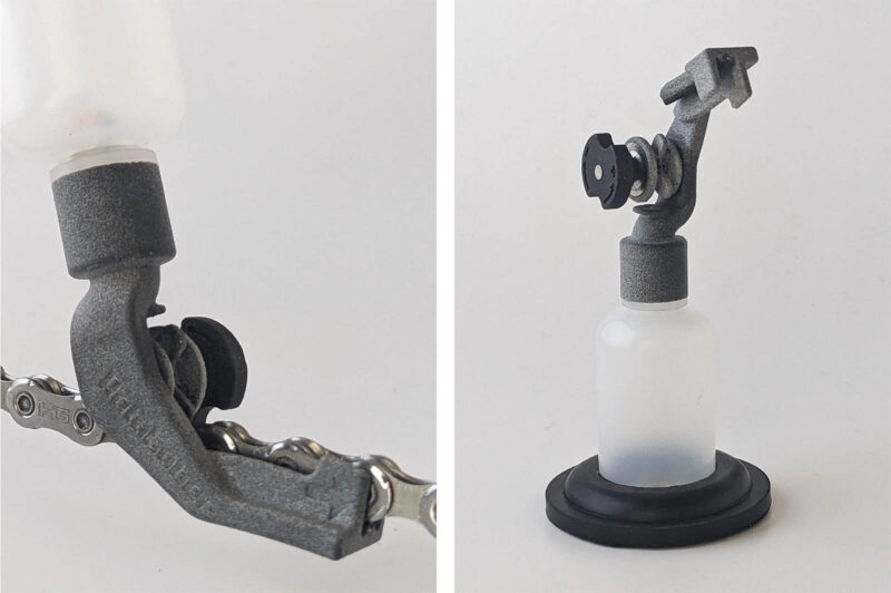 Hoewel het product waarschijnlijk niet in massa’s op de markt verschijnt, vind ik het wel een interessant ontwerp. Het idee is dat je de olie op de plek van de pennen vooral tussen het binnenste en het buitenste schakeltje wilt hebben. Daar zit de meeste wrijving tussen de ketting. Met een speciaal tandwieltje in de tool, druppelt de olie daar precies tussen. Zowel boven als onder. Toch is het grootste voordeel dat je altijd de hele ketting smeert. Met een normaal flesje wil je er nog weleens naast schieten namelijk.