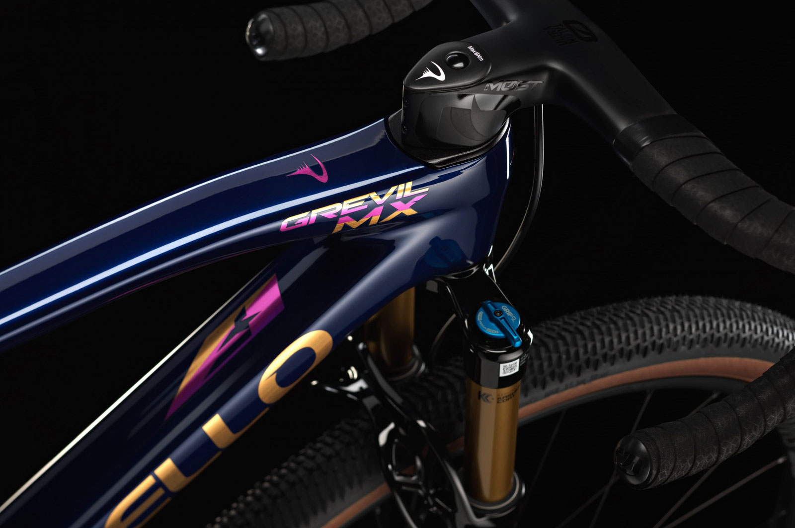De kleur is erg goed gedaan en de kleur van de logo’s past weer erg goed bij de voorvork. De vraag blijft: is de Grevil MX nou een gravelbike of mountainbike? Wij zijn er wel uit in ieder geval. Een opvallende creatie, dat is het zeker.