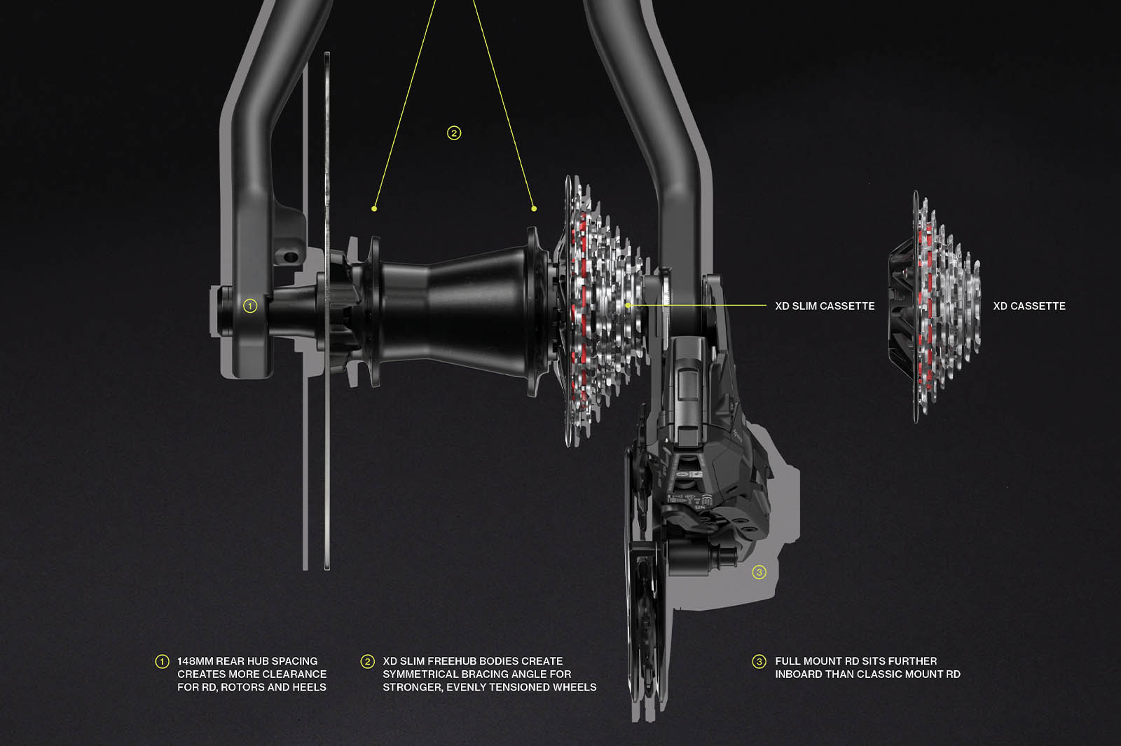 Ook komen de nieuwe derailleurs (enkel) beschikbaar in Full Mount-optie. Voor de Hangerless-Interface dus, waardoor een derailleurpad overbodig is en de derailleur veel steviger in verbinding staat met het frame. Daarnaast komt SRAM met een speciale uitvoering van de XD-body. De smallere XD Slim-body zorgt voor meer ruimte rondom het wiel, die wél aansluit bij een 148 mm brede naaf. Zo hebben voeten meer bewegingsruimte en kunnen spaken onder een stevigere hoek worden gezet.