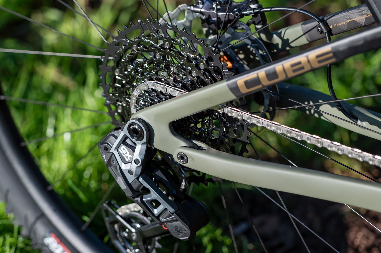 Ook de SRAM GX AXS groep is meteen raak. Mocht je nog nooit met een elektronische groep hebben gefietst, dan is dit wel echt een flinke stap vooruit. Hoewel GX de goedkoopste elektronische groep uit het gamma van SRAM is, kan ik alleen maar zeggen: 100% raak. Zeker voor een bike waar je lekker relaxed over de trails gaat rijden. De groep is robuust, geruisloos en bijzonder accuraat. Natuurlijk is de groep iets zwaarder dan bijvoorbeeld SRAM X0 of XX, maar die paar honderd gram ten opzichte van de topgroep is verwaarloosbaar voor het doel van deze bike. De robuustheid van bijvoorbeeld een veilig weggewerkte batterij krijg je daarvoor terug. En dat is lekker als niet elke seconde, maar avontuur telt. Als je echt voor het lichtste en snelste wil gaan, heeft Cube natuurlijk de cross country Cube AMS Zero99.