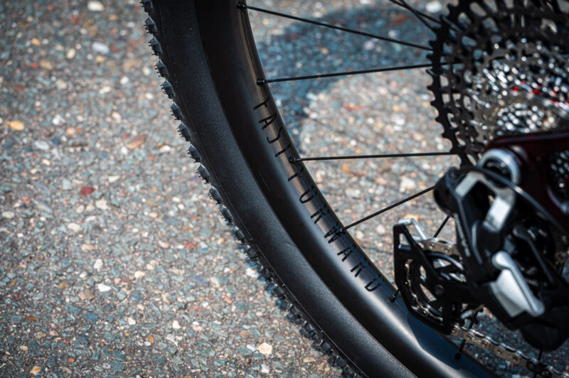 Deze set heb ik getest in de Trek Procaliber die we zelf opbouwden met allemaal verschillende onderdelen. En daar passen de wielen eigenlijk perfect in. Het is qua onderdelen namelijk niet het topsegment, maar echt het middensegment. Als ik een eerste testrit maak, valt het ‘extra’ gewicht me eigenlijk niet echt op. Wat vooral opvalt zijn de andere eigenschappen. De manier waarop de 2,4 inch brede band in de 30 mm velg valt, geeft meteen een stabiel gevoel op onverharde ondergronden.