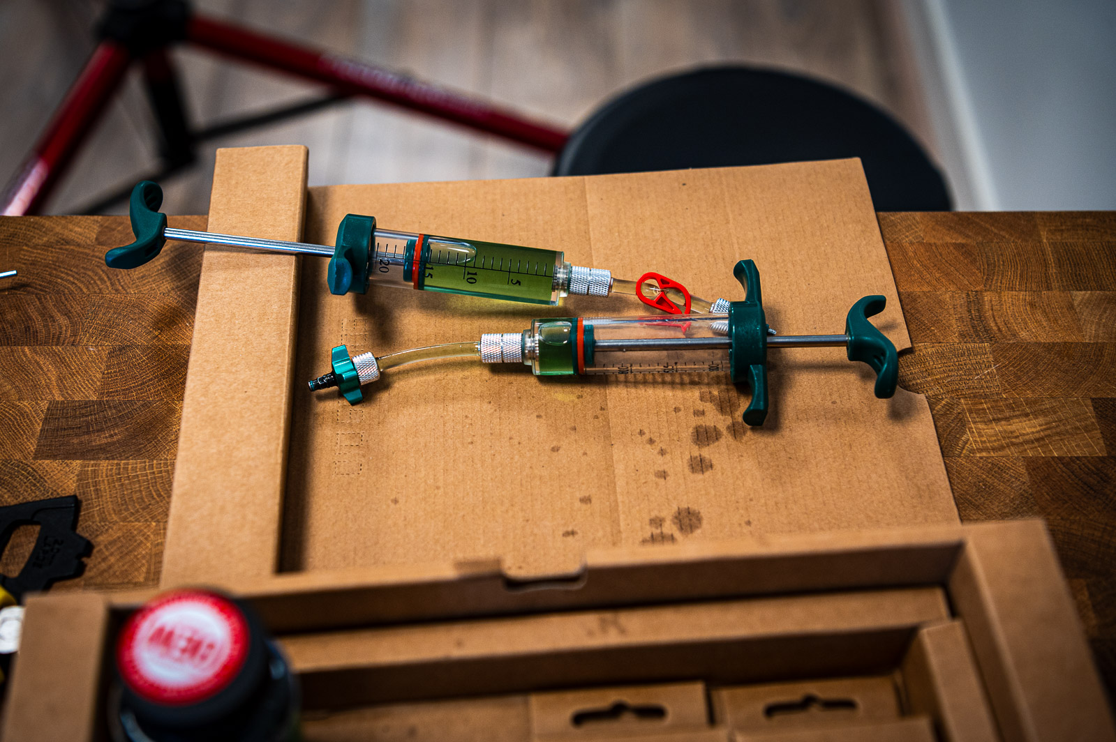 De lichtgroene accentkleur van de remmen is misschien wel geïnspireerd op de kleur van de nieuwe olie. Met het uitbrengen van deze nieuwe serie remmen is SRAM helemaal overgestapt op minerale olie. In samenwerking met het oliemerk Maxima ontwikkelden ze een vervanging voor de Dot 5.1 synthetische olie. De keuze voor andere olie, vraagt ook om een andere ontluchtingskit, die we gelukkig meegeleverd krijgen in de Expert Box.
