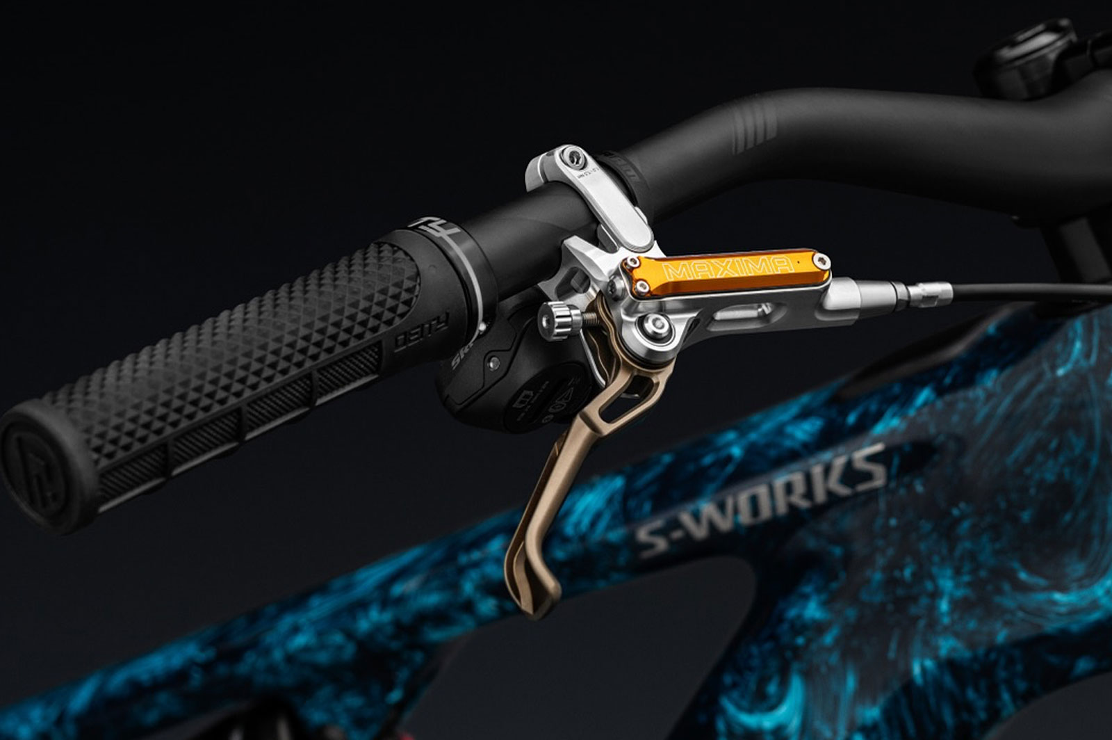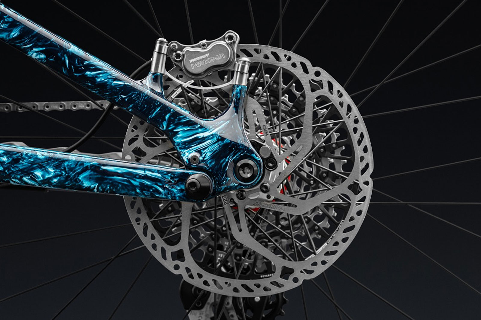 Ook erg dik zijn de Trickstuff Maxima remmen. Uiteraard met 4 zuigers en een schijfdiamter van 223mm. De groepset is de SRAM XX Eagle Transmission. En dan is de crankset weer aangepast naar de Cane Creek Electric Wings titanium crankarmen, oef!